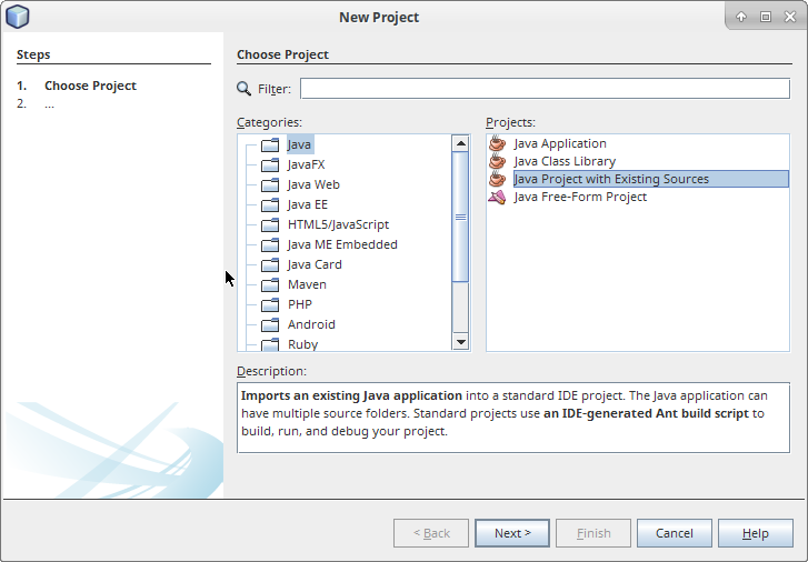 The process is composed by three easy steps:To create a Netbeans peoject using your Greenfoot scenario, you first need to create a new project. Select "File->New Project", then select "Java Project with Existing Sources"
